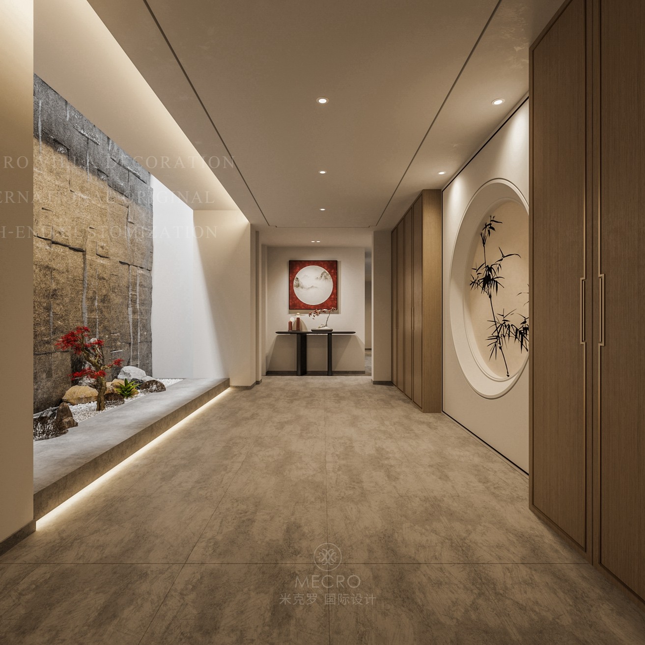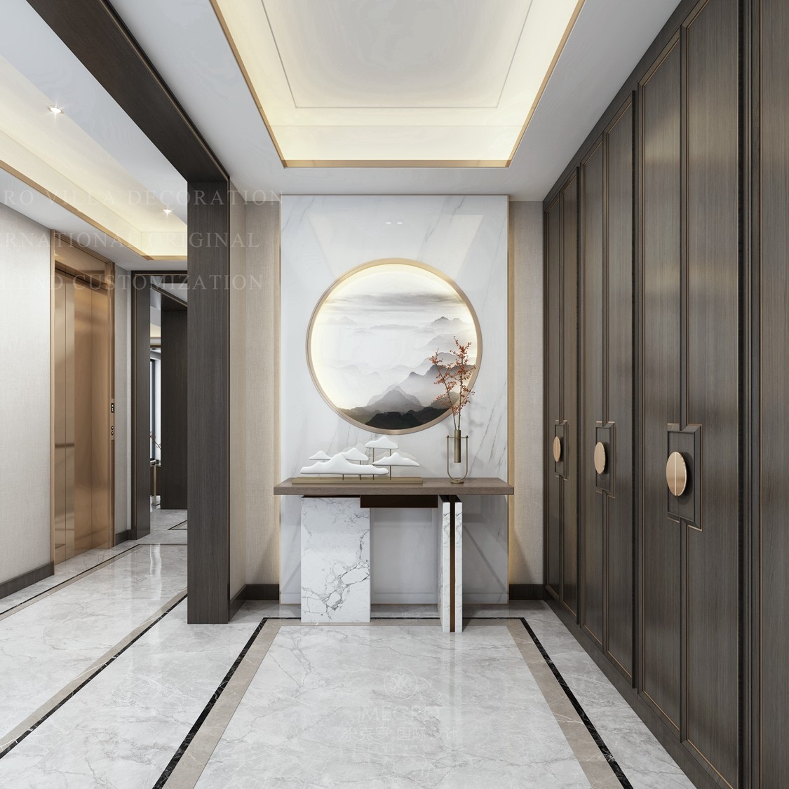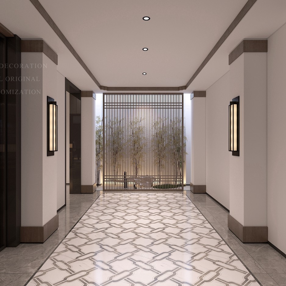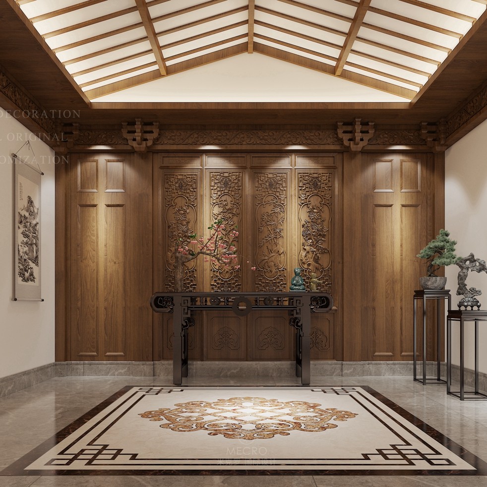 中式或新中式的玄关设计多以禅意为主,讲究东方意蕴和堪舆风水,中国堪舆学主张“直则冲”、“曲则顺”,所以在装饰上方圆元素偏多,常在一隅设立圆润微型景观,充满东方风情。
