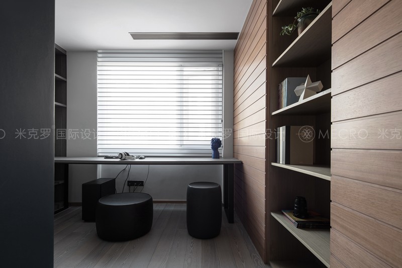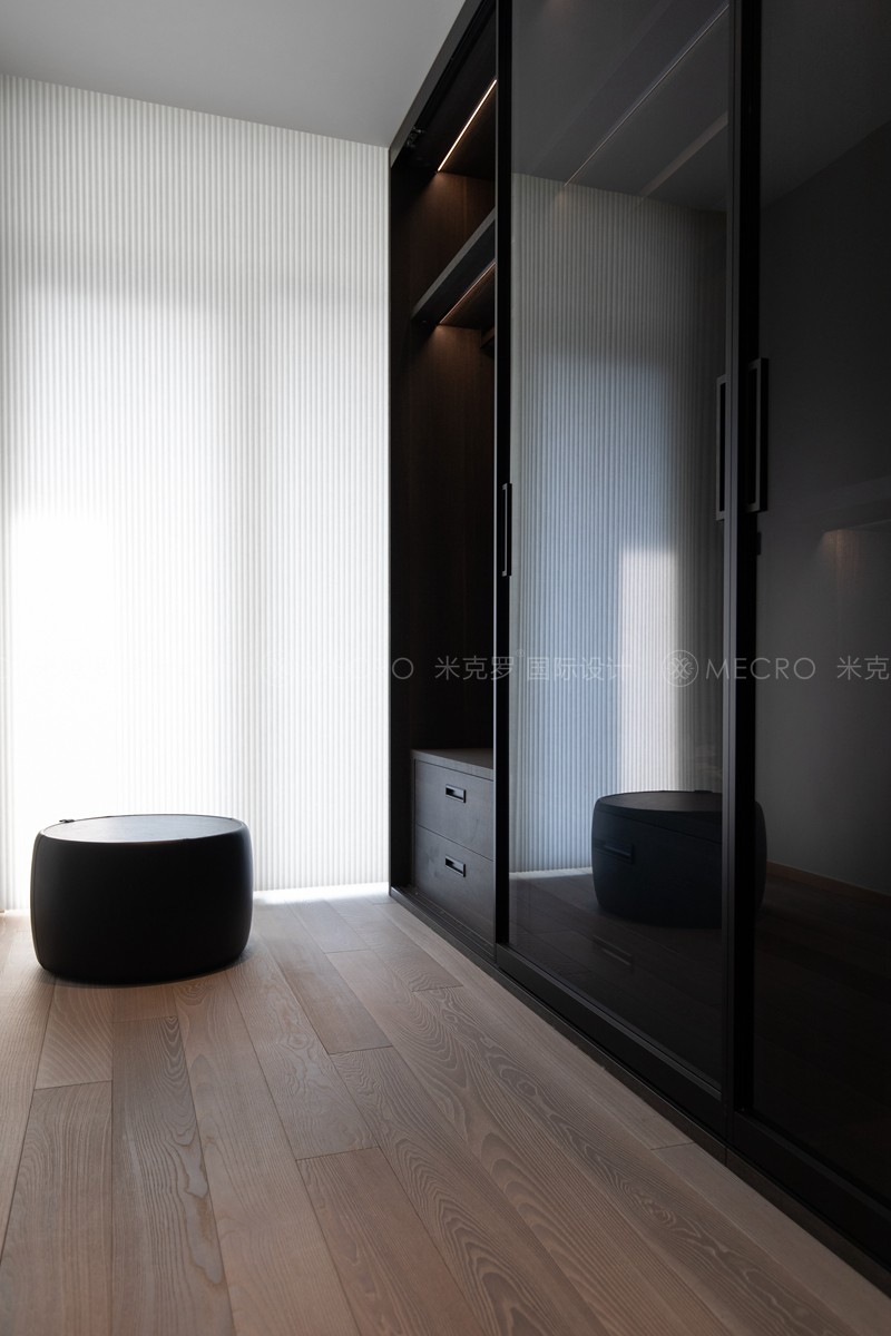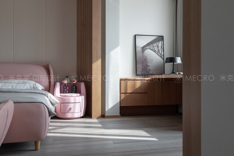 主卧室干净雅致,没有哗众取宠的繁复装饰,在硬装的细节上,提炼纯正、典雅的现代元素,比例结构上做到简繁适中,特别是墙面造型初见眼前一亮,日后久看不厌。硬装材料采用深色的地板搭配干练现代式家具,显得格外稳重,安心,顶面装饰采用明快的现代线条,简洁明亮,不压抑。