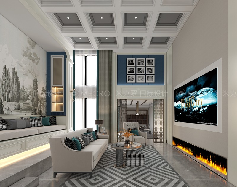 挑空设计实现空间大气通透,顶面采用美式经典线条,用暖色灯带作为点缀,没有过多其他装饰,显得个整个吊顶干净整洁,两边的玻璃移门与镂空屏障也不会过多的阻碍事业且还保证了空间的隐私性,电视背景墙采用护墙板,电视机采用挂墙式,墙面采用艺术涂料,整个背景墙看起来清新脱俗。