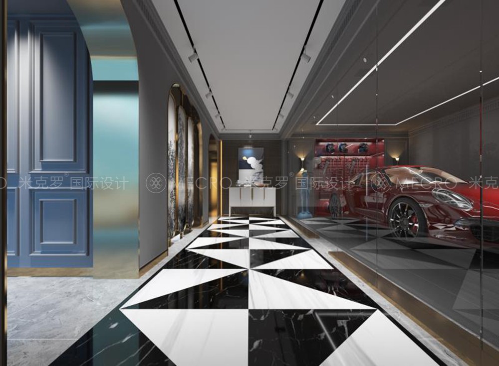 走廊:走廊部分墙面采用法式线条护墙板,与一整面墙采用现代玻璃饰面形成现代与传统法式的激烈碰撞,另一面的拱形造景,及地面的黑白花砖很好的缓解了这种强烈对比,进行了现代与法式的交融,充满当代与浪漫的情调。