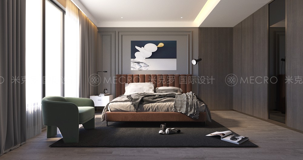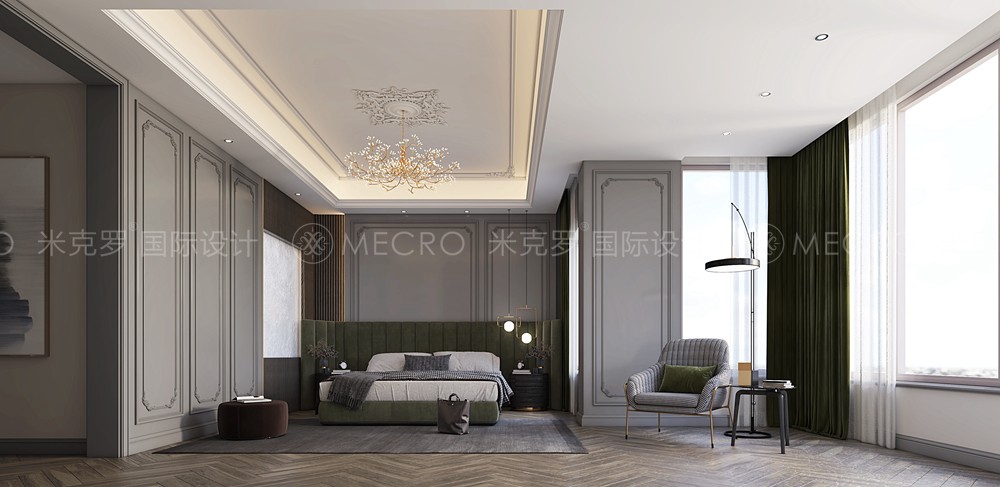 主卧:主卧的设计理念以简洁为主,塑造卧室淡雅的空间氛围。床头背景处,辅之法式线条造型的灰色系护墙板,祖母绿色的床,配以黄灰色系的鱼骨地板,打造了卧室法式浪漫的所在。