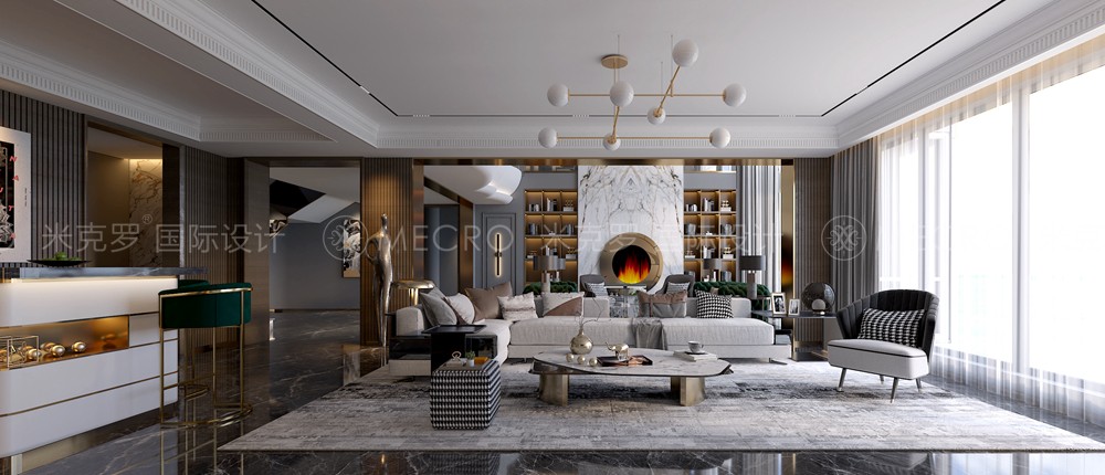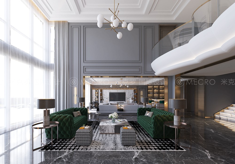 客厅:在本案的设计中,客厅空间选用了多种材质来表现业主追求的空间效果。在对颜色材质搭配设计上,同样花费了设计师不少的巧思。祖母绿的沙发,在整个客厅空间中格外独特,贯穿悬挑空间的大背景墙墙面采用大理石石材饰面并嵌入壁炉,另一面则采用了干净利落的法式线条护墙板配以莫兰迪蓝灰色系,营造法式的现代浪漫,在明亮光线的点缀下,相对硬朗的材质在彰显现代精致的同时也不失古典的雅韵,给予了空间新的生命力。