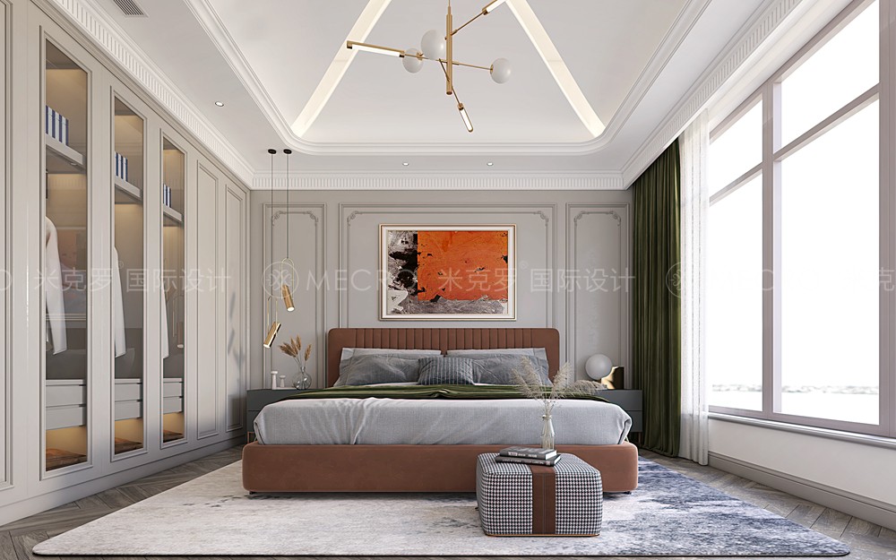 次卧:与主卧有区别的是保留了法式韵味的同时,加入了橘红等暖色系,使整个空间活泼了起来,现代气息更强了些,氛围更加温暖。
