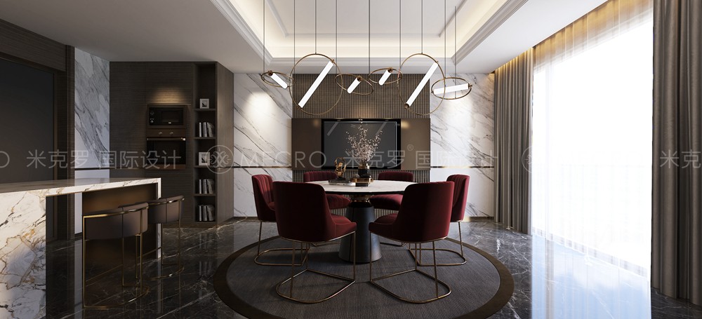 餐厅:与客厅相邻的的餐厅空间中,选用客厅的造型元素来围塑用餐氛围----在立面上主要结合大理石、木饰面、木格栅等的材质。而圆形的餐桌、酒红色的餐椅,精致的环形灯,则塑造出回味的法式现代风情。