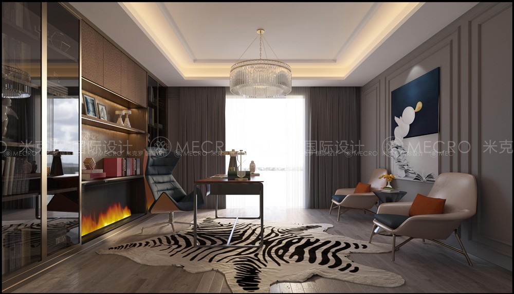 书房:线条造型的护墙板装饰墙面,家具主要以现代为主,造型多曲面线型,具有法式浪漫的不羁。浅色的地板上,配上虎皮纹样的地毯,加上趣味的背景画,打破传统规矩沉闷的氛围,使整个空间新颖起来。