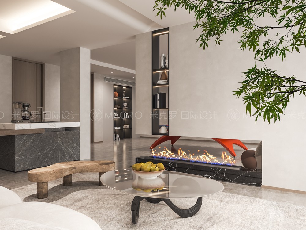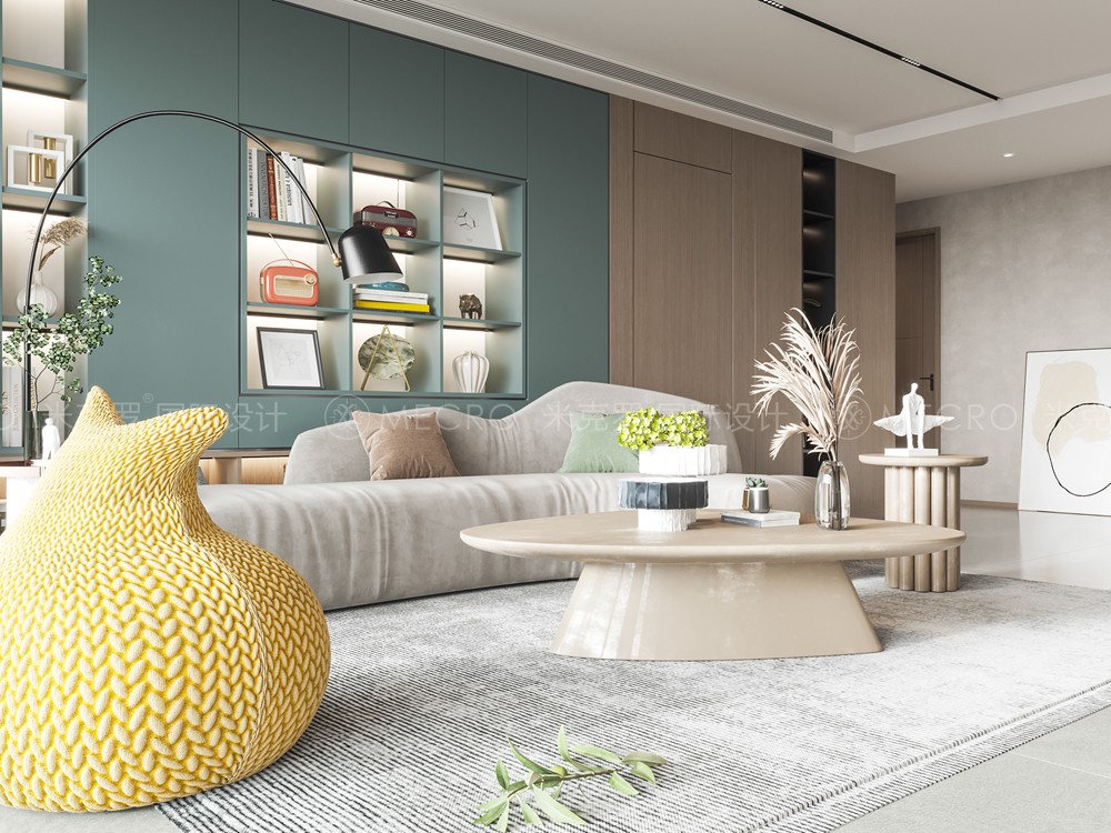 客餐厅整体空间色调主要采用文雅静谧的跳色调,主要由大理石饰面,暖色乳胶漆,以及硬包饰面相结合。设计师通过空间梳理,针对客厅部分运用对称和简练的线面构成手法,确立出空间的中轴线,并且在立面处理上力求在疏密比例的线面衔接中做到延伸的细节追求,使原本不对称的背景墙更加和谐庄重,体现的不仅是空间熏陶出来的意境,更是对生活细节追求的态度。